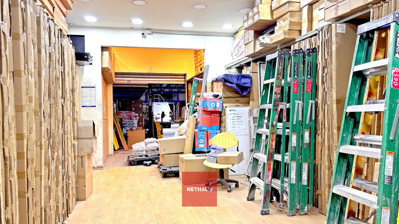 Primer piso: dividido en tres áreas: zona de estacionamientos, amplia bodega y local comercial o showroom. Incluye altillos metálicos adosados al medianero que aumentan la superficie de bodegaje en aproximadamente 180 m².